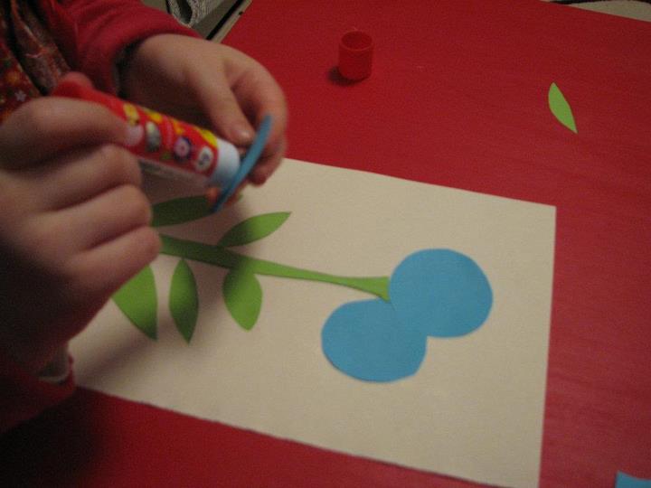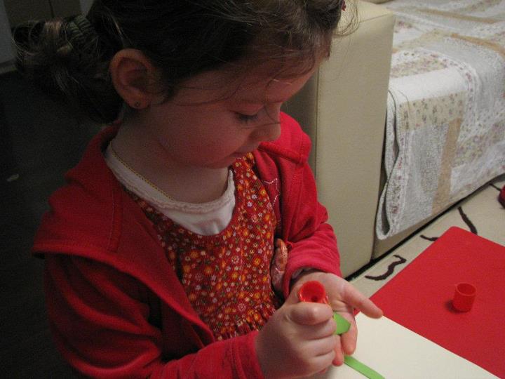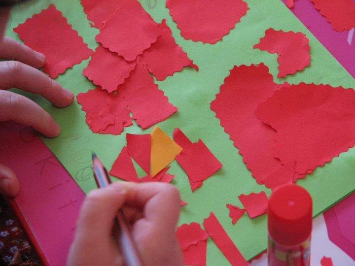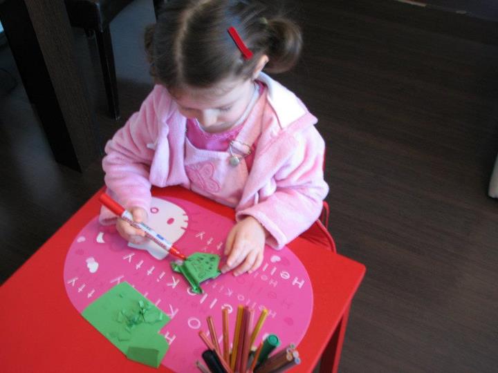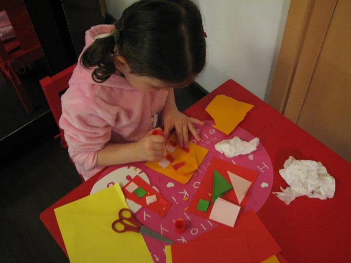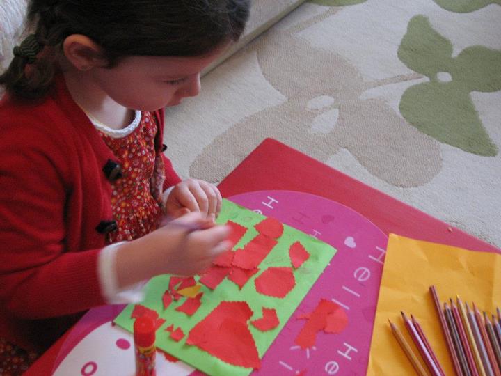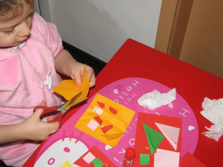 Aici a decupat de una singura toate bucatelele de hartie, dupa care le-a lipit, tot singura, acolo unde a dorit, spunandu-mi ca vrea sa construiasca o casuta.