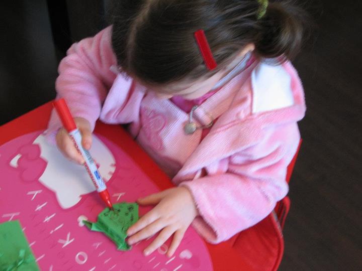 Tati a reusit sa faca o broscuta, iar M. a ornat-o in stilul ei caracteristic…ii place sa aplice puncte mici pe orice (ea spune ca pistruiaza).