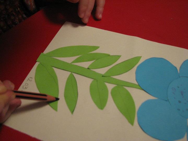 Am intervenit putin in activitatea “decupat si lipit”: am decupat eu partile componente ale unei flori, iar M. le-a numit pe fiecare, apoi le-a lipit acolo unde le era locul. I-a placut la nebunie sa deseneze, ulterior, detaliile pe frunze, petale, centrul florii. Deci, am repetat culorile, am numarat petale si frunze, am repetat din ce e alcatuita o floare, am invatat sa lipim cu grija, fara sa depasim marginile, dupa care am “pistruiat” si datat “felicitarea”.