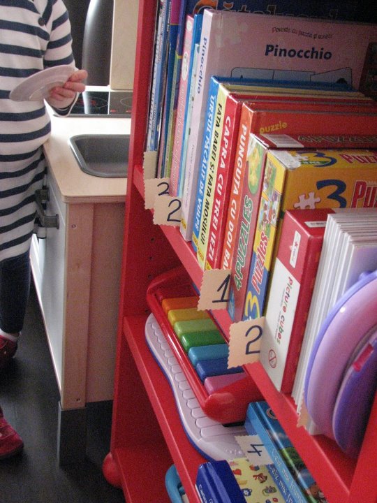 O idee excelenta a fost aceea a unui magazinas/unei biblioteci, in care S. venea la cumparaturi, iar M. era vanzatoarea. Au confectionat “etichete cu pretul”, cu cifre de la 1-5, destul de mari…