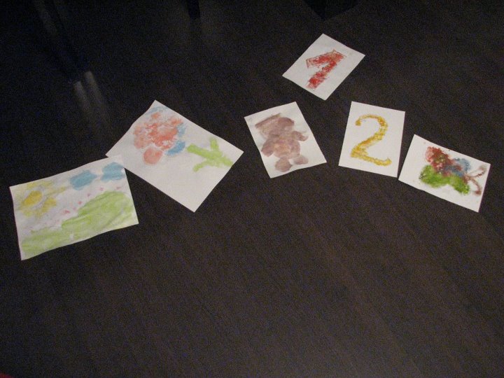 La sfarsitul serii, aveam o colectie in miniatura de pictura cu materiale neconventionale (le-am lasat la uscat, iar de dimineata le-am strans cu grija…sarea se uscase beton, deci, nu mai face murdarie absolut deloc.