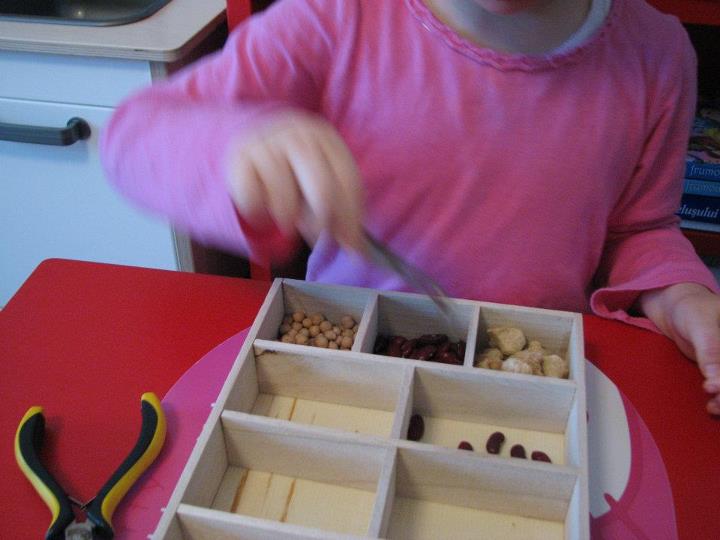 Si a doua activitate ne-a placut la nebunie! Cu o penseta si un cleste mic de tot (si sub atenta mea supraveghere), M. a mutat bobite de naut, fasole si soia (ajuta la motricitatea fina, dar il educa pe copil sa aiba rabdare, sa faca lucrurile incet, dar sigur).