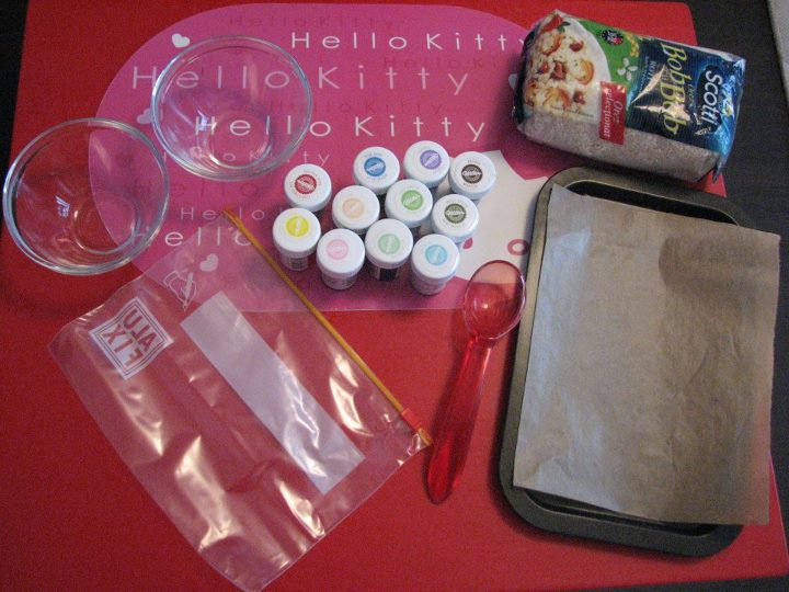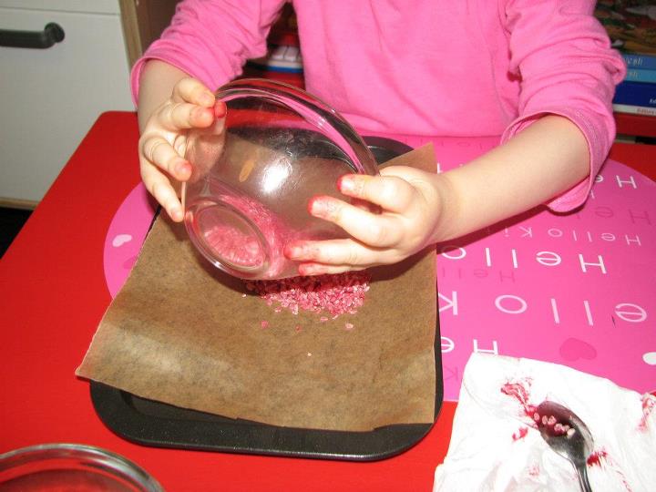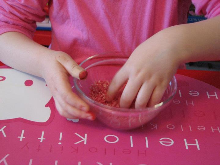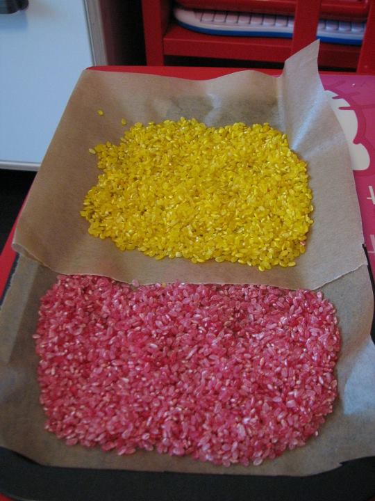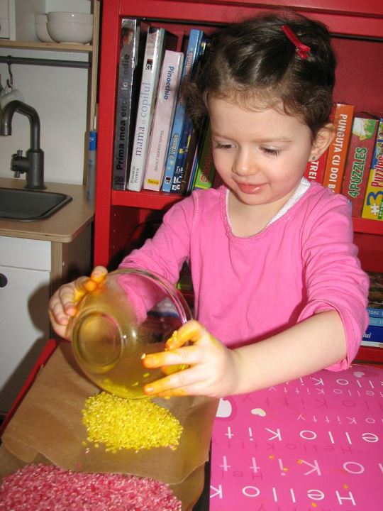 Desi, initial, M. si-a ales singura doua culori, dupa ce a vazut cat de distractiva e activitatea, si-ar fi dorit sa incerce toate culorile…Orezul acesta, dupa ce s-a uscat si nu mai lasa culoare, se poate pune in cutiute cu capac ermetic si se pot face tot felul de activitati cu el (eu ma gandesc sa o las pe M. sa orneze oua de Pasti cu el, sa lipim pe hartie orez in forma de cifre, dar mai sunt o multime de alte utilizari posibile). Dar, cea mai frecventa activitate este aceea de a lasa copilul sa se joace cu orezul intr-un recipient mai mare (gen cutie cu capac), unde ii puteti pune canite, linguri, iar el sa se joace cu manutele prin orez, sa il transfere in alte recipiente etc etc.